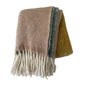 Eyelash fringed throw. Made of 25% Wool + 55% Acrylic + 20% Nylon. Measures 125×150 cms. Made in India